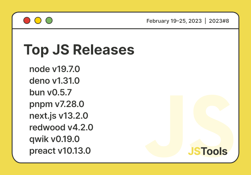 📅 February 19–25, 2023, Highlights: new releases of JS Runtimes (node, deno, bun), UI frameworks, testing tools, toolings, chart and visualizations, databases drivers, UI animations, and more!
